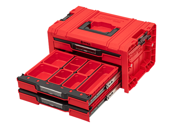 Qbrick System PRO Drawer 3 Toolbox er en romslig, modulær verktøykasse utstyrt med tre uttrekksskuffer på metallsklier. En praktisk knapp gir enkel tilgang til innholdet. Expert-versjonen av skuffen er utstyrt med 9 justerbare skillevegger og 21 skuffer (7 på hver hylle) som gjør det mulig å organisere både langsgående og små verkstedtilbehør. Polyamid-sidekontakter gir enkel tilkobling med andre moduler fra PRO- og ONE-linjene (med Vario-deksler og multiadapter). Det komfortable håndtaket gir komfort i å bære verktøyene. Identifikasjon av innholdet er gitt av et etikettrom beskyttet av en polykarbonathette. Det automatiske systemet med å låse skuffer mot å trekke ut garanterer høy komfort ved bruk av boksen.