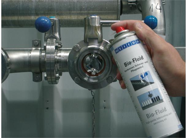 Den brukes til smøring, beskyttelse og pleie av presisjonsmekanismer, som sprayolje for produksjons- og påfyllingsanlegg og sin smøremiddel på påfyllings- og emballeringsanlegg. Denne sprayen kan brukes over alt hvor det oppstår sporadisk, teknisk uunngåelig kontakt med næringsmidler eller næringsmiddelembalasje. WEICON Bio-Fluid er utviklet for bruk i næringsmiddel- og drikkevannsindustrien, og for den farmasøytiske og kosmetiske industrien.